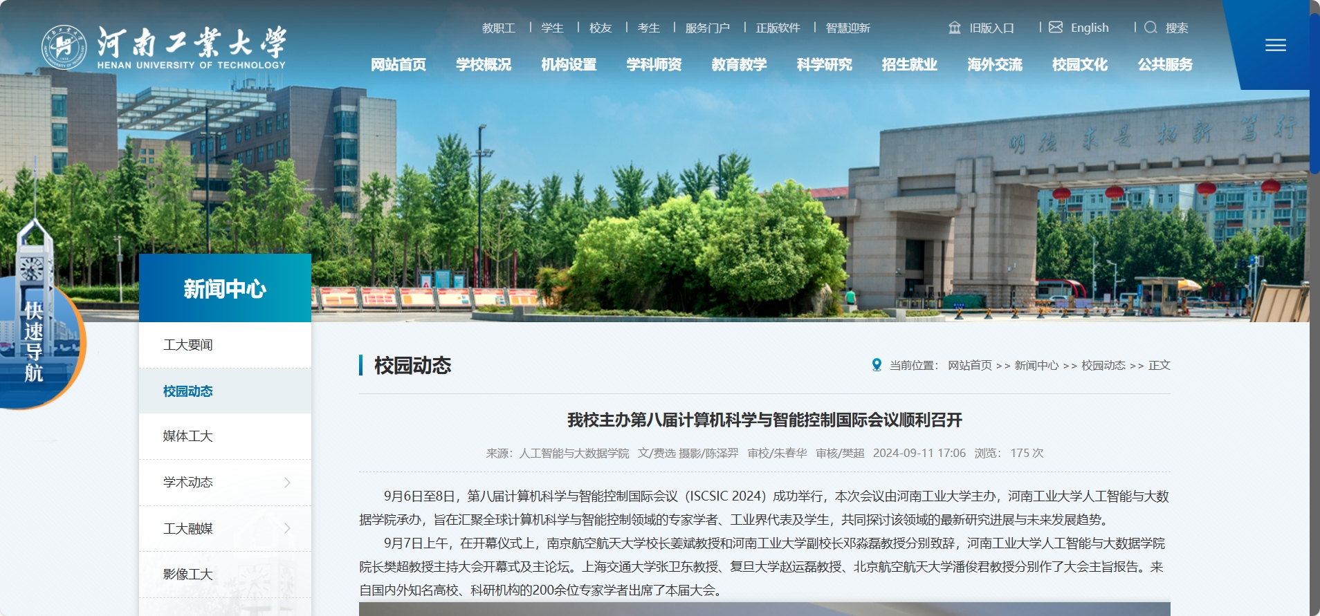 2024 8th International Symposium on Computer Science and Intelligent Control (ISCSIC 2024), was held successfully in Zhengzhou, China, during September 6-8, 2024. The conference is organized by Henan University of Technology, co-organized School of Artificial Intelligence and Big Data, Henan University of Technology, Henan University of Economics and Law. Thanks to Henan University of Technology for covering ISCSIC 2024 on the front page.